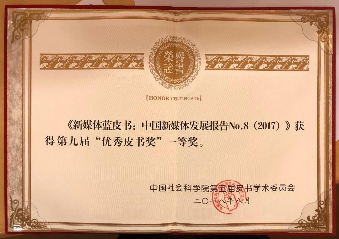 《新媒体蓝皮书:中国新媒体发展报告No.8(2017)》获得第九届“优秀皮书奖”一等奖证书