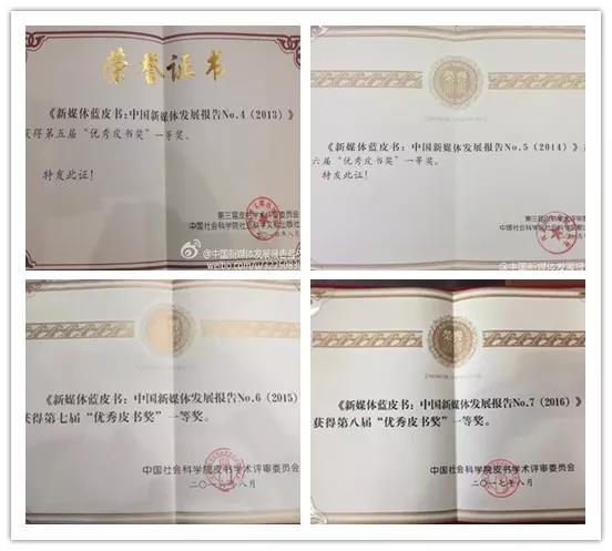 2014、2015、2016、2017年,新媒体蓝皮书连续获得“优秀皮书奖”一等奖